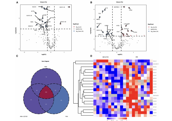 [高龄孕妇-七子育嗣方组与高龄产妇组、高龄孕妇组与年轻孕妇组卵泡液中的差异表达蛋白。(A)高龄孕妇-七子益肾方组和高龄孕妇对照组中差异表达蛋白的火山图。(B)高龄孕妇组和年轻孕妇对照组中差异表达蛋白的火山图。(C)展示高龄孕妇组、高龄孕妇-七子益肾方组和年轻孕妇组之间共有及特有已鉴定蛋白的维恩图。(D)高龄孕妇-七子益肾方组和高龄孕妇组中排名前20的差异表达蛋白的表达热图。DEPs,差异表达蛋白;FF,卵泡液。]